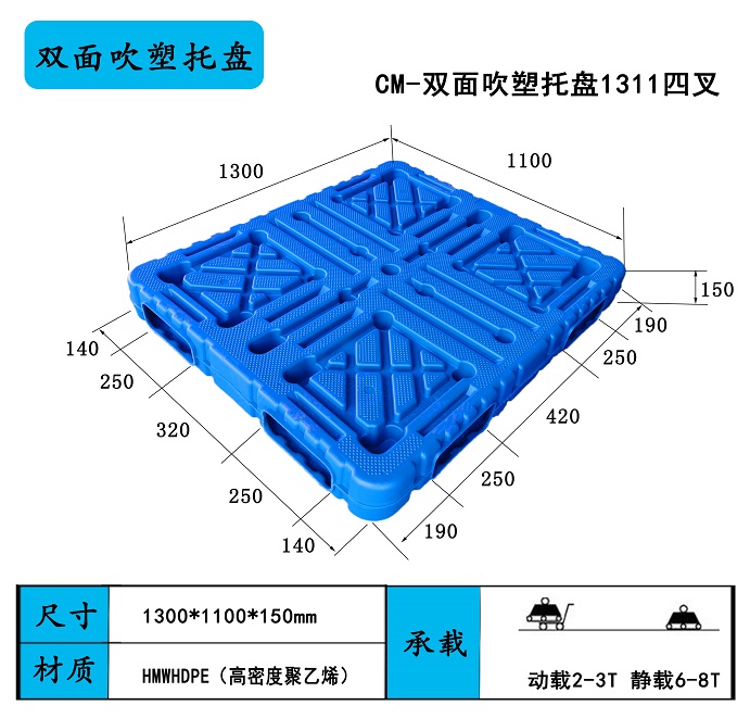 產品描述:1311吹塑托盤,雙面中空塑料托盤1.3*1.1米,石化專用叉車托盤1311