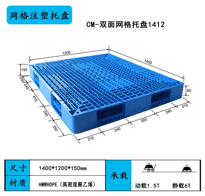 產(chǎn)品描述:雙面網(wǎng)格塑料托盤(pán)1412(1210),網(wǎng)格塑料托盤(pán)1412(1210)雙面,雙面叉車(chē)塑料托盤(pán)